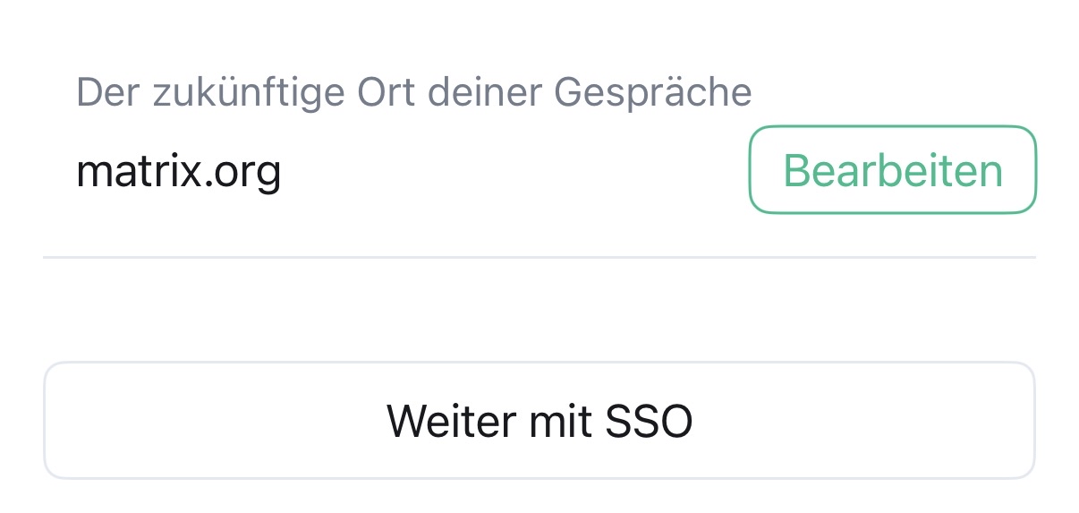 Achtung: Hier ist standardmäßig der Matrix Server eingetragen. Wählen Sie hier bitte “Bearbeiten” um sich nicht versehentlich auf einem falschen Server anzumelden.