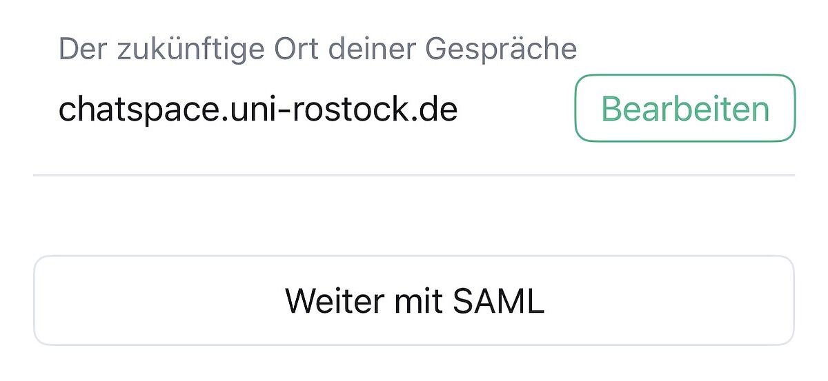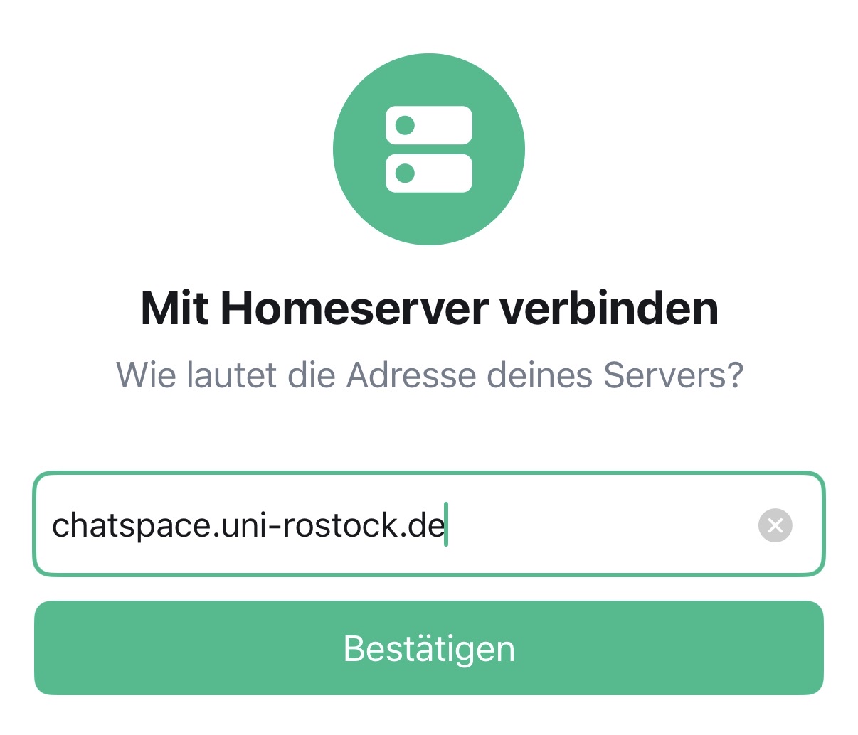 Im Start-Screen bitte "Anmelden" wählen und auf der danach folgenden Seite den Server von "matrix.org" auf "https://chatspace.uni-rostock.de" ändern.