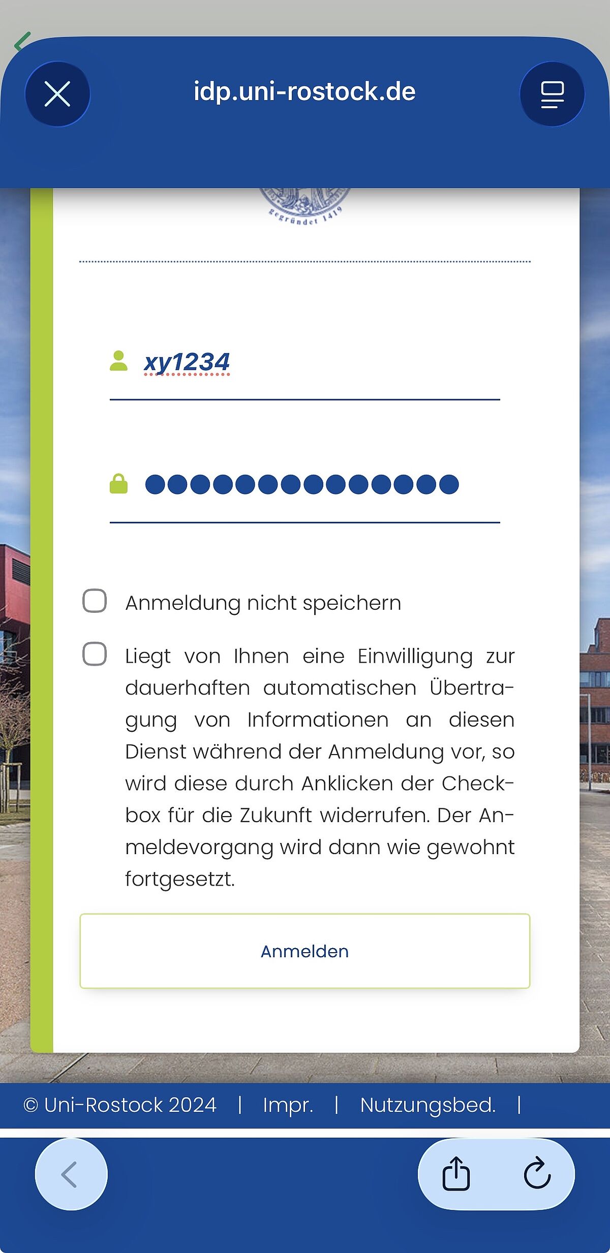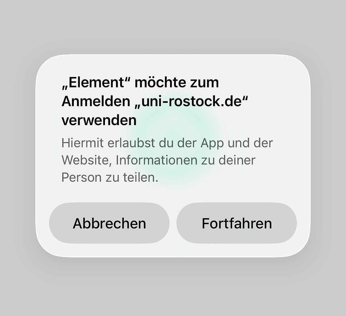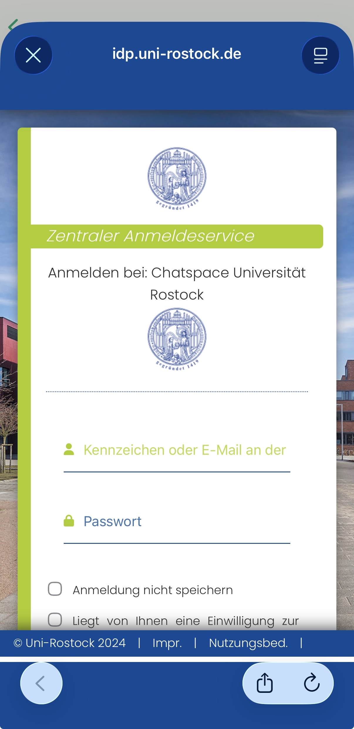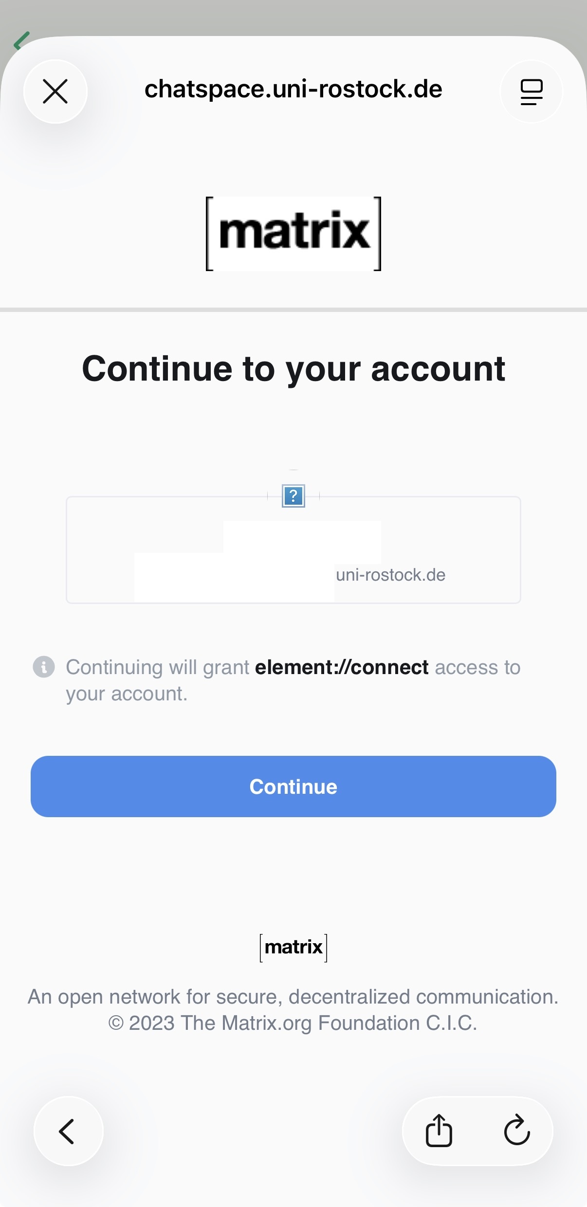 Nach der Änderung der Server-URL über die Schaltfläche "Weiter mit SAML" gibt iOS einen Hinweis aus, wo die Anmeldung erfolgt. Danach erfolgt die Weiterleitung zur Shibboleth Anmeldeseite. Dort wie gewohnt mit Nutzerkennzeichen und Passwort anmelden, der Übertragung der Daten zustimmen und im Anschluss am Chat anmelden durch Bestätigung mit "Continue".