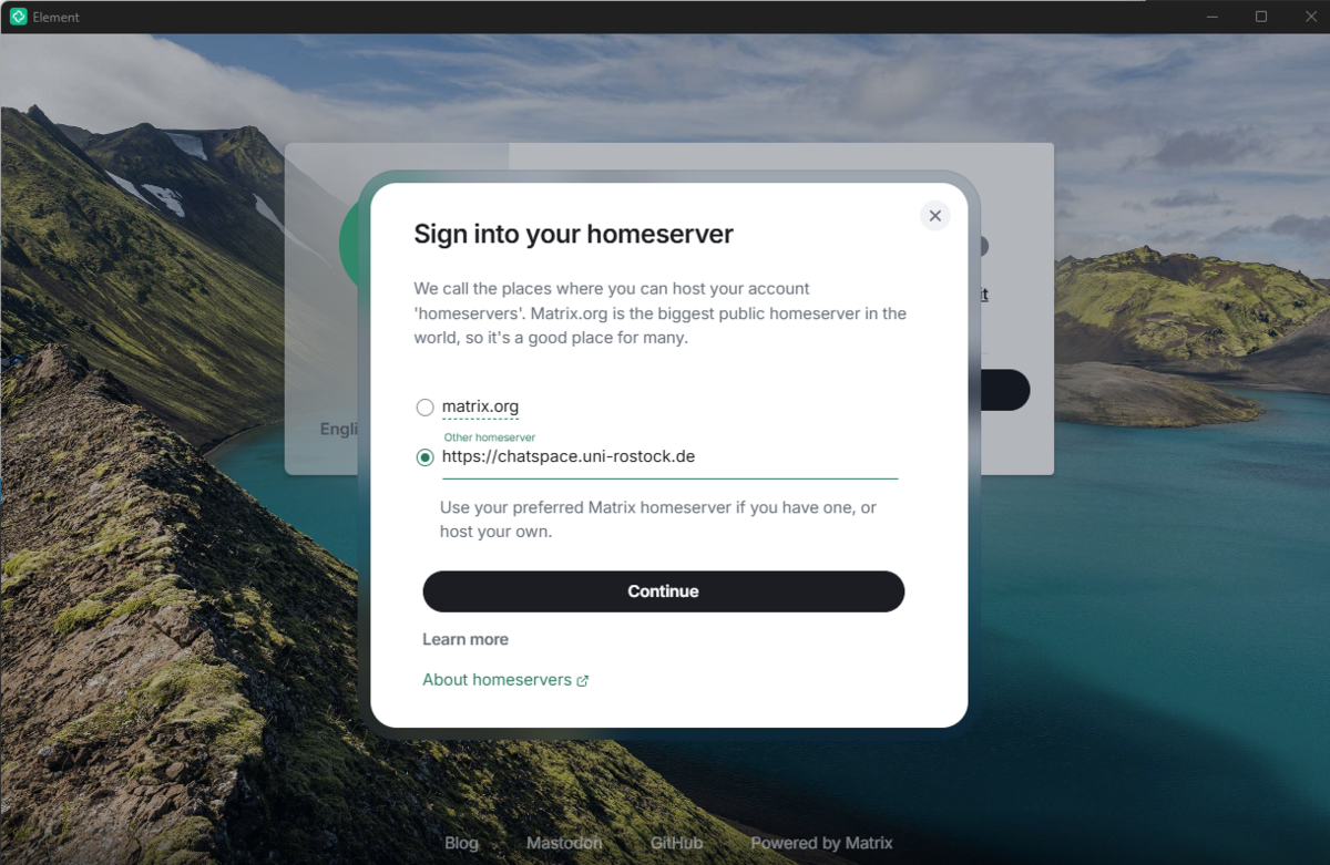 ACHTUNG: Beim Aufruf des Clients ist standardmäßig die URL des original Matrix-Servers hinterlegt. Diese muss auf den Server der Universität Rostock angepasst werden.