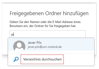 2. Erste Buchstaben der E-Mail-Adresse der Shared-Mailbox eintragen > Konto auswählen